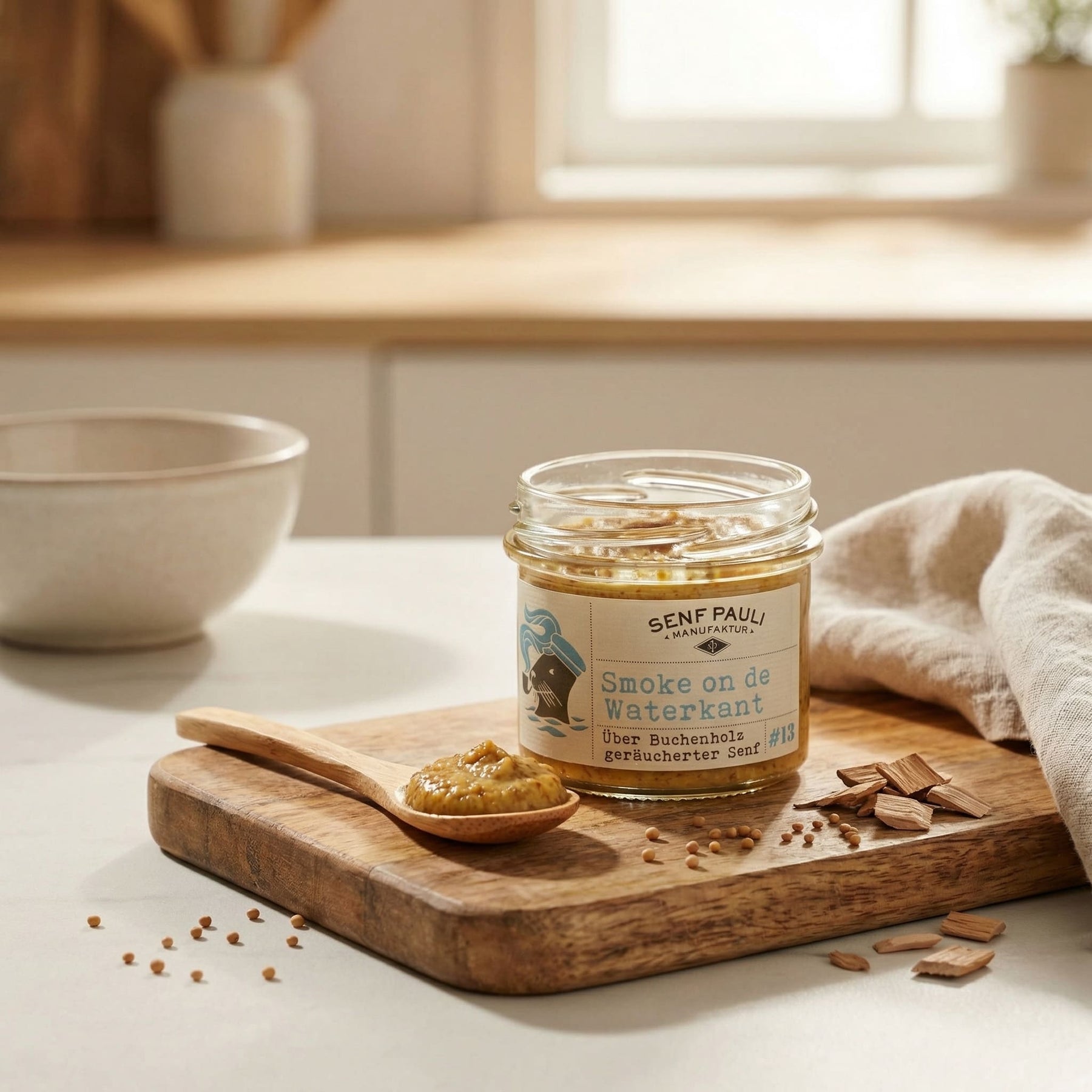 Smoke on de Waterkant ist ein aussergewöhnlicher Senf mit natürlicher Rauchnote, der über Buchenholz geräuchert wird. Der Name spielt auf die Hamburger Elbküste